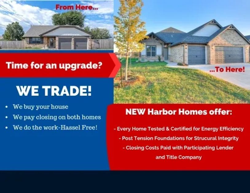 Trade your used house for a brand new Harbor Home! Whether you are interested in custom building or investing in one of our move-in ready homes, we can trade! We do this as a courtesy to our customers and help ease the transition from old to new. Once we have an agreement in place for your new Harbor Home, we will determine the fair market value of your home using a reputable real estate agent. The price quoted will be determined by the Comparative Market Analysis of your neighborhood. If you are satisfied with the quoted price, we will trade!